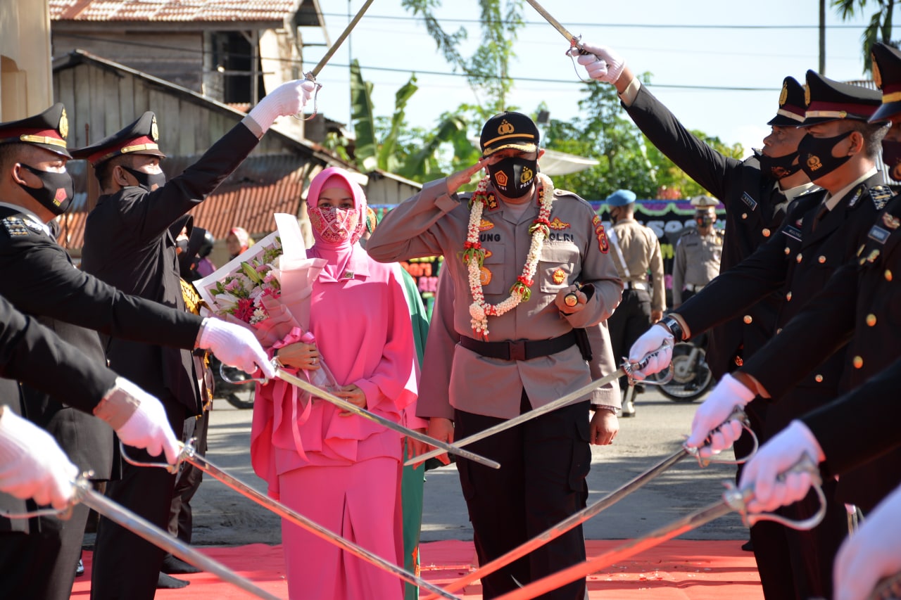 LANGSA, BEDAHNEWS.com – Pisah sambut Kapolres Langsa, antara AKBP Giyarto, SH, SIK. dengan AKBP Agung Kanigoro Nusantoro, SH, SIK, MH disambut dengan upacara penyambutan tradisi Pedang Pora, Kamis (05/11/2020).