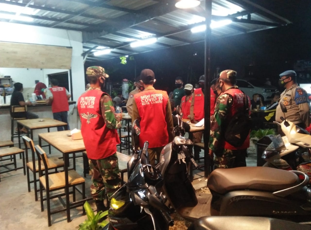 LANGSA, BEDAHNEWS.com – Petugas gabungan dari personel Kodim 0104/Aceh Timur, Polres Langsa dan Satpol PP Kota Langsa menyasar cafe, warung kopi dan pusat jajanan di sepanjang Jalan A. Yani, Jalan Sudirman, dan Jalan Panglima Polem dalam operasi Yustisi, Rabu (24/2/2021) malam. Pedagang dan pembeli yang tidak taat aturan Protokol Kesehatan (Prokes) menjadi target dalam operasi ini.
