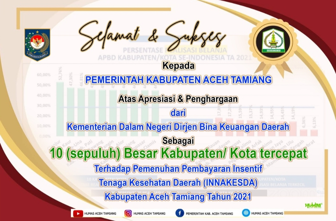Dengan adanya penghargaan dari Kemendagri ini, semoga Pemerintah Kabupaten Aceh Tamiang dapat mempertahankan prestasi ini dengan tetap konsisten dalam pemenuhan realisasi pembayaran Innakesda dengan menjamin ketersediaan alokasi Innekesda pada APBD TA 2021 sampai dengan bulan Desember 2021.