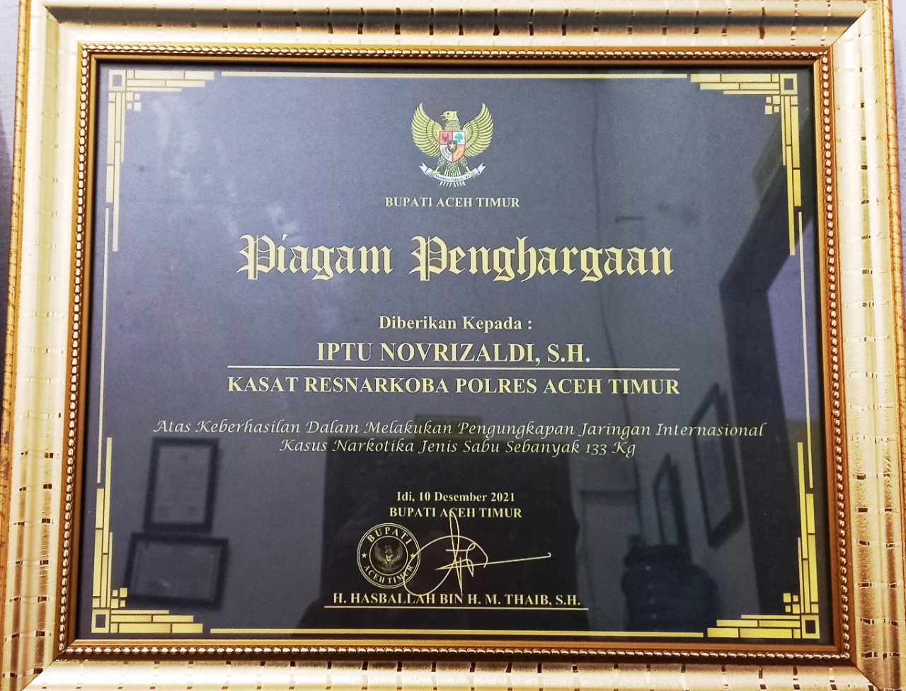 Penghargaan ini sebagai bentuk apresiasi Pemerintah Kabupaten Aceh Timur atas keberhasilan Polres Aceh Timur dalam mengungkap kasus peredaran narkotika jenis sabu jaringan internasional seberat 133 Kg yang berhasil diungkap pada Jum’at (03/12/2021) di Desa Lhok Dalam, Kecamatan Peureulak dan pengungkapan kasus pencurian dengan kekerasan menggunakan senjata api yang terjadi di wilayah Peunaron pada Selasa, (02/11/2021)