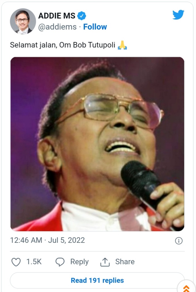 “Selamat jalan, Om Bob Tutupoly,” tulis Addie MS di twitternya.