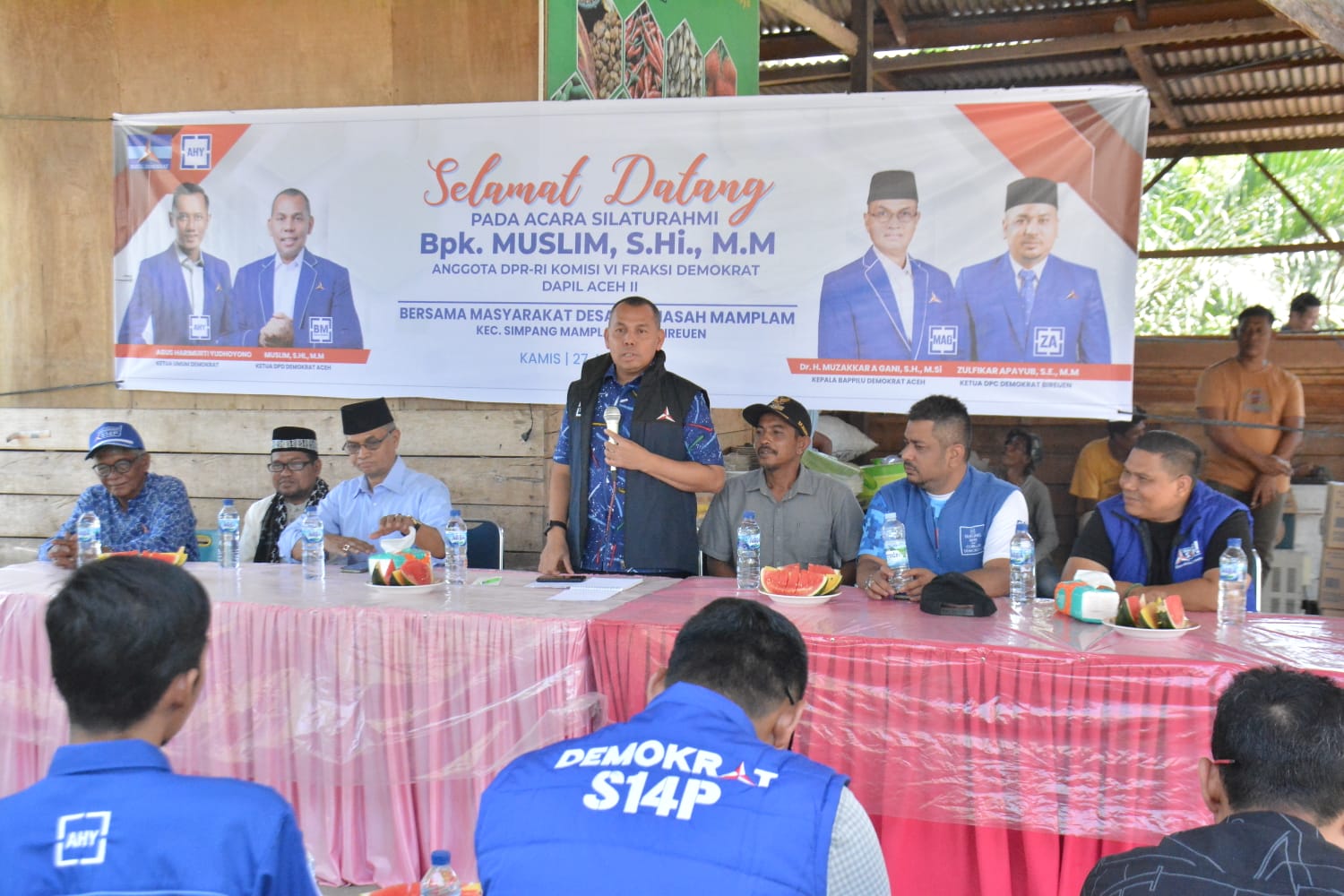 “Alhamdulillah, hari ini bisa bersilaturahmi dengan masyarakat disini, saya sampaikan salam Pak SBY dan Mas AHY kepada masyarakat disini, beliau punya sejarah panjang dengan Aceh, di masa beliau menjabat presiden, mampu mendamaikan konflik GAM dan RI, itu patut kita kenang dan syukuri,” ujar Muslim yang juga anggota DPR RI Tiga periode itu