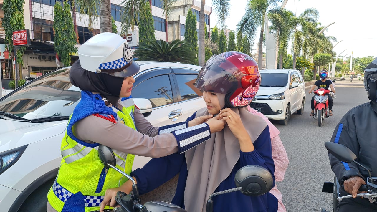 Setelah diberhentikan, pengendara kemudian ditegur agar tidak lupa memakai helm.