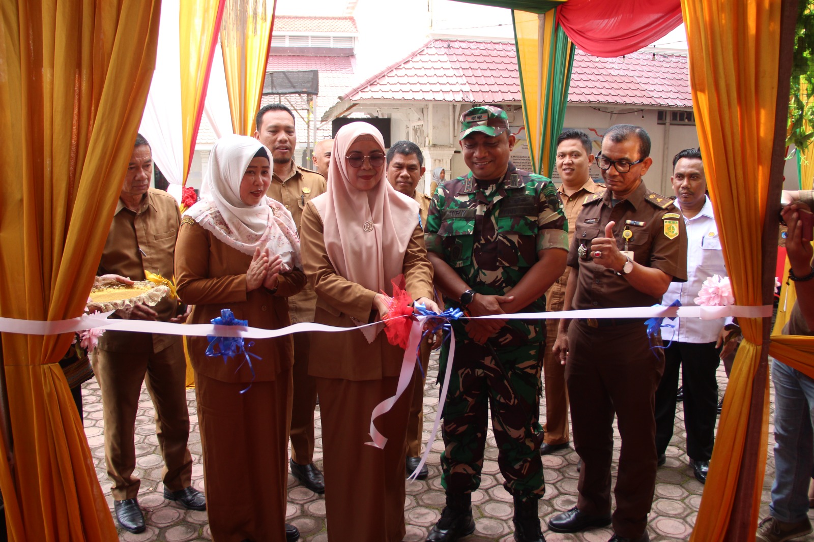 Dandim 0104/Atim Letkol Inf Tri Purwanto, S.I.P. didampingi Staf Ahli Bid. Pemerintah, Hukum, Politik Siti Zuriah, S.H., Kadisdikbud Kota Langsa Drs Suhartini, M.Pd bersama para Kabid di jajarannya saat memotong pita pembukaan Pameran Museum Temporer, Selasa (3/10). (Foto: Dok. Kodim 0104/Atim).