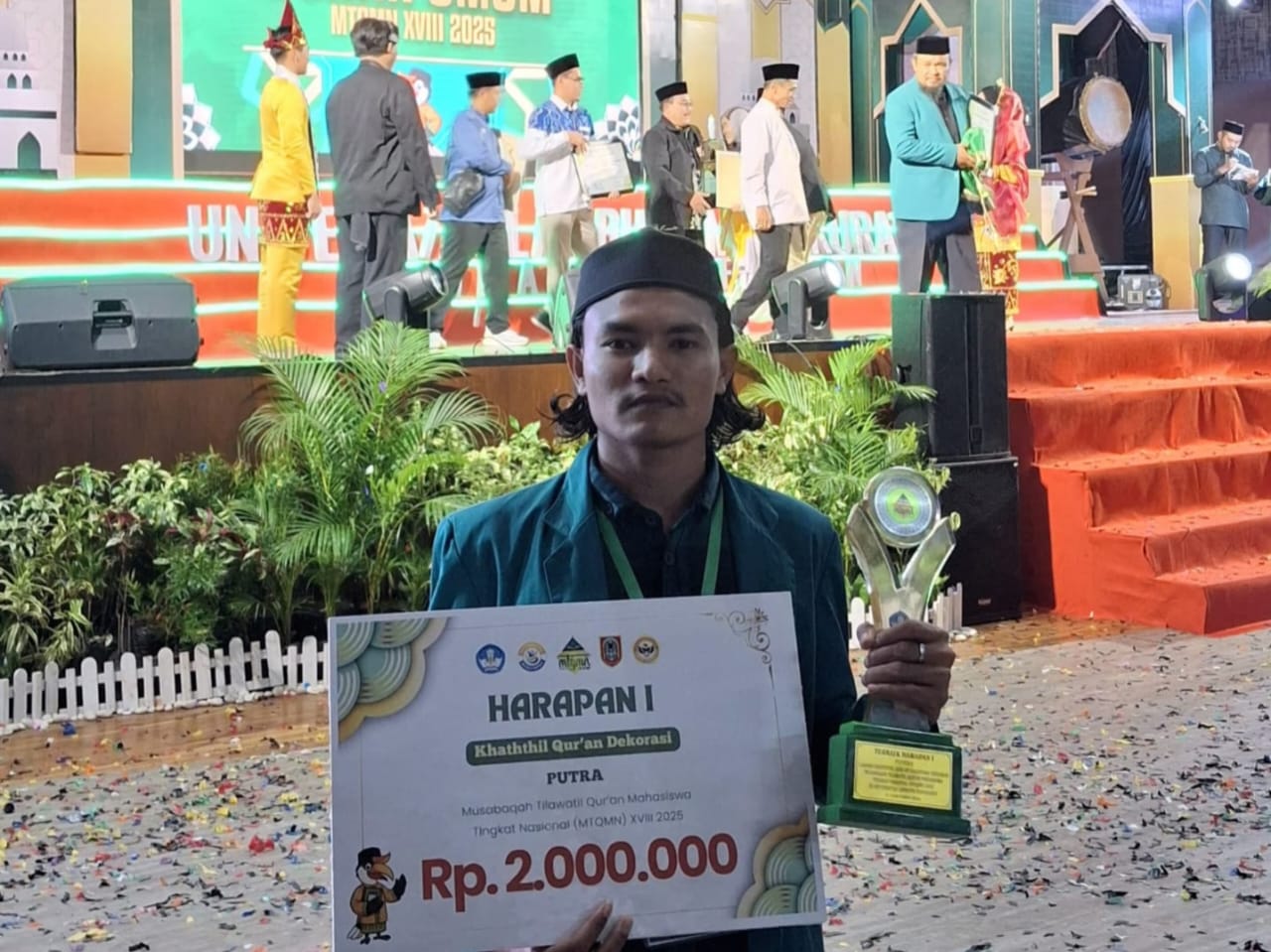 Adalah Mudawali Al Khalidi, mahasiswa Program Studi Pendidikan Agama Islam (PAI), Fakultas Agama Islam (FAI) UNIKI, yang sukses membawa pulang penghargaan tersebut di cabang Khattil Qur’an Dekorasi.
