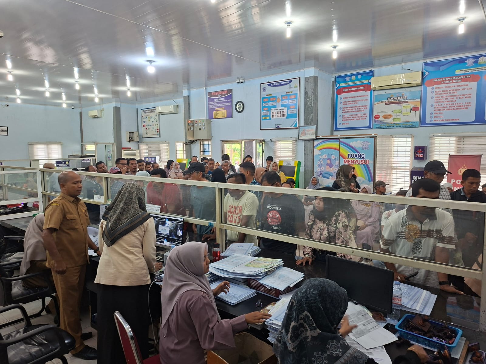 Pantauan di lokasi menunjukkan situasi halaman kantor penuh sesak dengan kendaraan roda dua dan roda empat. Sementara di area pelayanan, antrean panjang mengular di setiap loket, mulai dari penyerahan berkas, proses verifikasi data, hingga loket pembayaran. Meski ramai, pelayanan terpantau tetap berjalan tertib dan terkoordinasi.