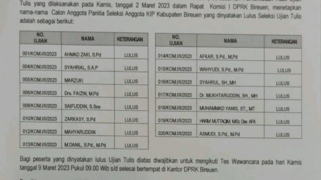 BIREUEN, BEDAHNEWS.com - Komisi I Dewan Perwakilan Rakyat Kabupaten (DPRK) Bireuen mengumumkan 15 nama yang lulus ujian […]
